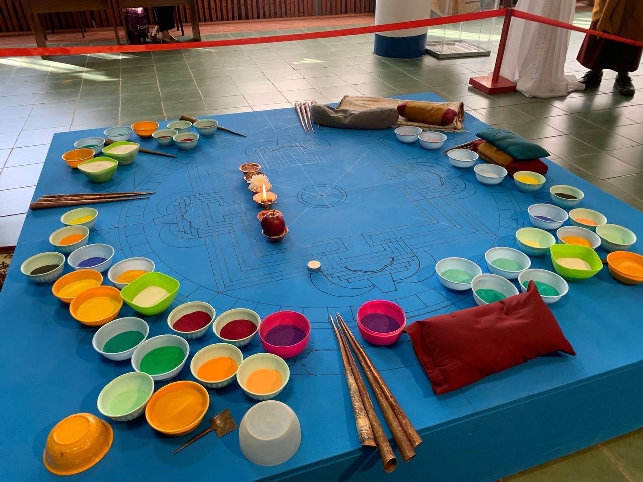 Все желающие могут созерцать за многочасовой, требующей особой сосредоточенности работой строительства мандалы.