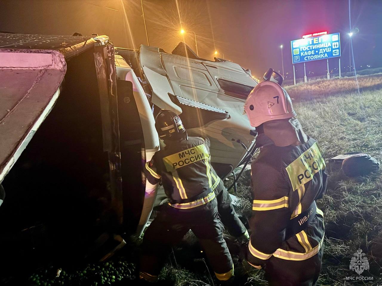 На месте происшествия произошло опрокидывание грузового автомобиля в кювет. Огнеборцы Калмыкии произвели смыв ГСМ с дорожного полотна и отключили аккумуляторную батарею на транспортном средстве.